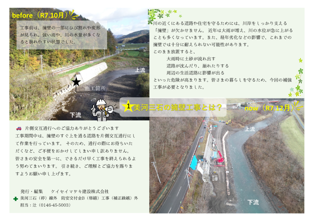 こちらは3箇所の修繕工事からなり、現在は三石川上地区にて擁壁の工事を行っています。構造物の経年による劣化や老朽化には修繕がつきもの、皆様の安全な暮らしを守るために必要不可欠な工事ですね。