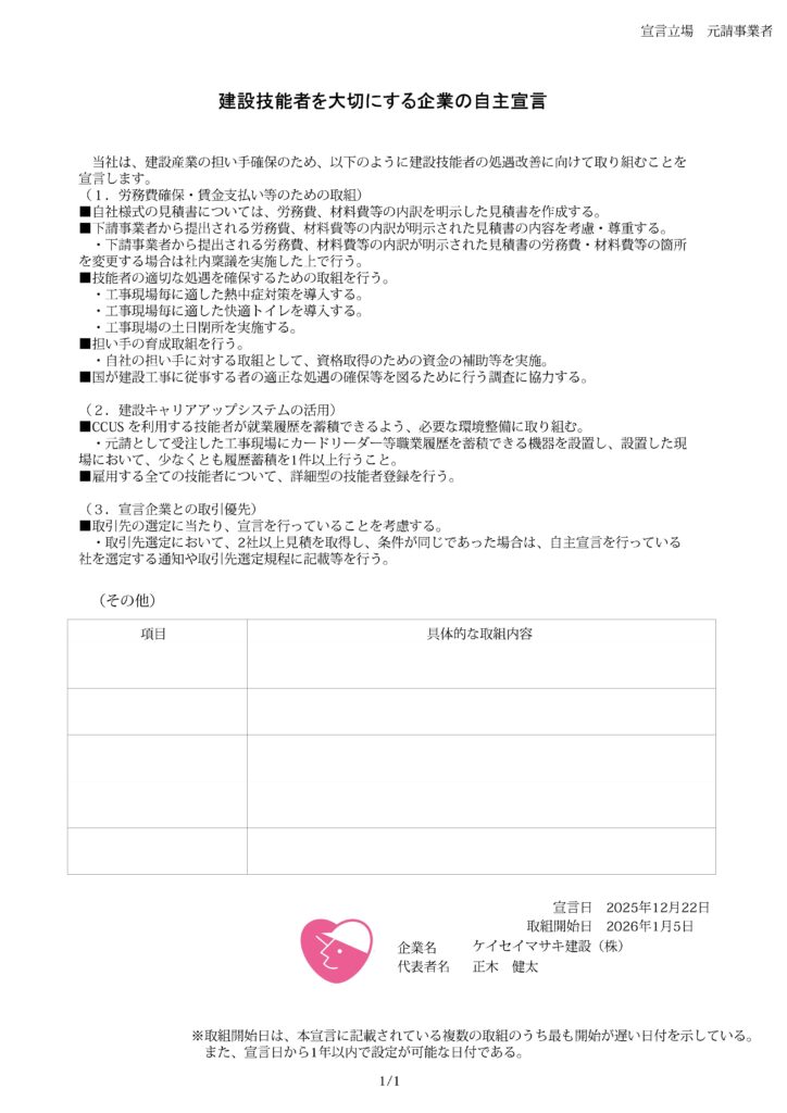 2025年12月22日付けで「建設技能者を大切にする企業の自主宣言 【愛称】職人いきいき宣言」