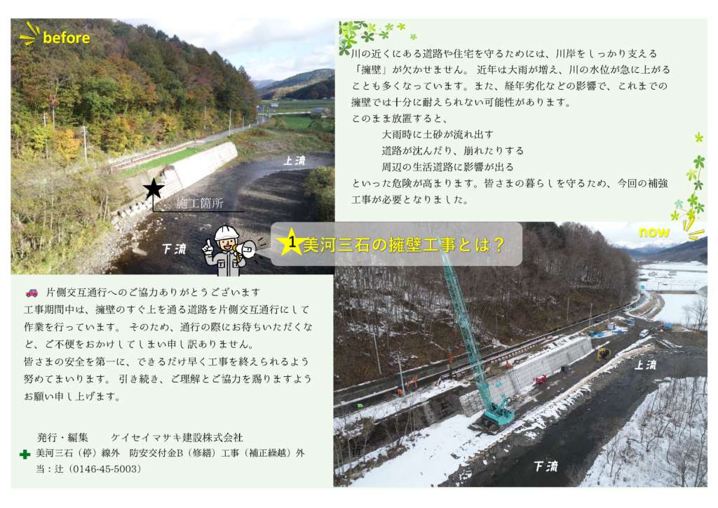 こちらは3箇所の修繕工事からなり、現在は三石川上地区にて擁壁の工事を行っています。構造物の経年による劣化や老朽化には修繕がつきもの、皆様の安全な暮らしを守るために必要不可欠な工事ですね。