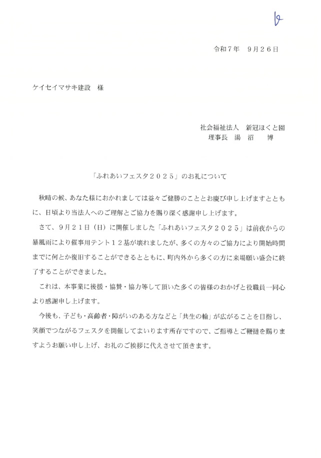 お礼のお手紙をいただき、「今後とも、子ども・障害のある方などと“共生の輪”が広がることを目指し、笑顔でつながるフェスタを開催していきます」とのメッセージがあり、とても印象に残りました。