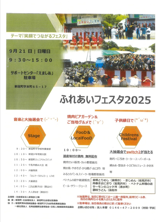 9月21日、新冠町で行われた「ふれあいフェスタ2025」にて、会場準備のお手伝いをさせていただきました。